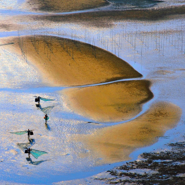 第二, 灘涂線條色塊的組合出精美的畫面。注意觀察灘涂的色塊,霞浦灘涂因為露出水面的時間不同,明暗差別很大,用鏡頭組合好各個色塊,選擇恢宏大氣的大色塊,才能使得畫面簡約優美。