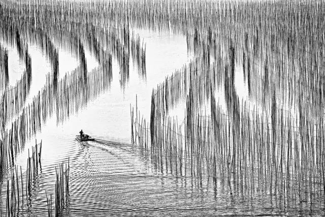 去霞浦拍攝時,不一定會遇到好的天氣,遇到陰天時是不是就不拍照了呢? 陰天依然可以捕捉灘涂美景,不過需要把拍攝模式轉為黑白,主要表現灘涂中的漁網漁船等物體的線條,與海水形成黑白剪影的效果。
