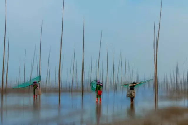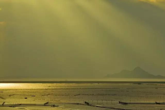 霞浦灘涂上以大面積的灰色為主,上面用于養殖的竹竿反光極為強烈,為了突出光影的效果,這些反光只能駕馭無法消除??梢钥紤]拍攝減少曝光量來進行控制畫面的主體明度,達到增強光影效果的目的。選擇日落日出時段拍攝,化不利為有利。此時竹竿上的光比小,色溫暖,竹竿被夕陽染成了金色,為灘涂風光造景造勢。曝光控制值要講究,如果對高光部位正確曝光,舍去暗部的細節,得考慮到灘涂的竹竿在遠處成像后非常細小,即使使用相機的點測光也無法測出高光部分的亮度,那 么只能使用評價測光來測量。曝光補償上減少2檔曝光。