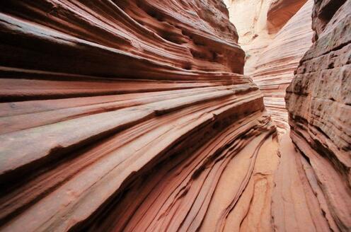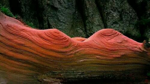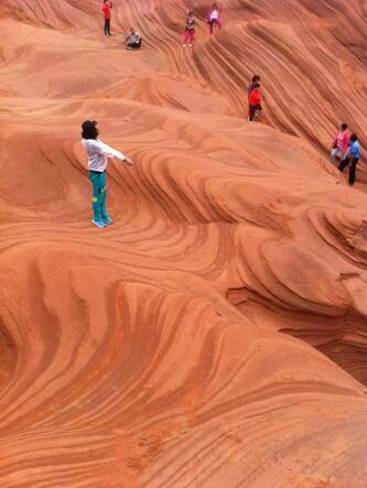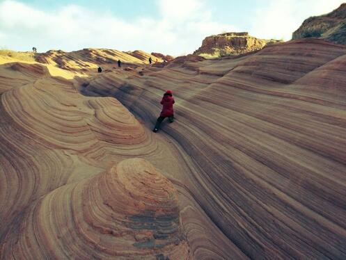 波浪谷是一種紅砂巖地貌,因巖砂上的紋路像波浪,被叫做"TheWave",即波浪。上世紀80年代,人們在美國亞利桑那州和猶他州交界處發現了波浪谷,神奇的外觀和極高的科研價值使其成為了世界八大巖石奇觀之一。而靖邊的波浪谷也有著與美國波浪谷媲美的紅砂巖峽谷。中國靖邊波浪谷和美國波浪谷的差距并不大,都是紅砂巖地貌,靖邊波浪谷更加年輕,只有6000萬年,很多砂土還沒來得及凝固為巖石,地處黃土高原與毛烏素沙漠交匯地帶的靖邊縣龍州鄉。