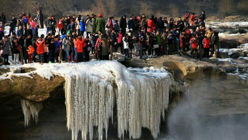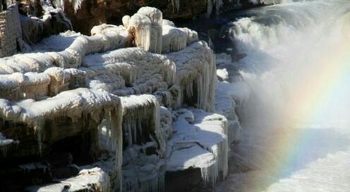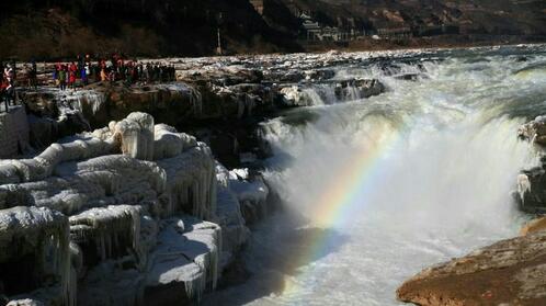 觀賞黃河壺口瀑布黃河壺口瀑布,其奔騰洶涌的氣勢如同中華民族的精神。它西臨陜西省延安市宜川縣壺口鄉,東瀕山西省吉縣。黃河至此兩岸石壁峭立,河口收束狹如壺口,故名壺口瀑布。瀑布落差9米,蘊藏豐富的水力資源。奔騰的黃河水聲震天地,絢麗的彩虹美輪美奐,輕煙生水底,冰掛透晶瑩,黃河壺口冬季美麗的自然景觀讓游人們流連忘返。