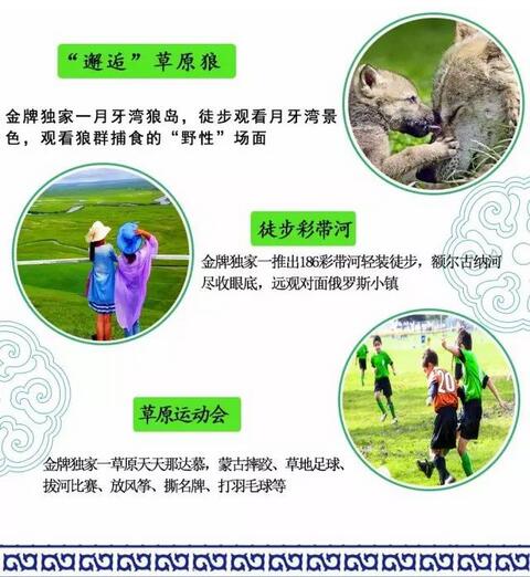 三、全程門票費。(金帳汗門票、敖魯古雅使鹿部落門票、莫爾道嘎森林公園門票、彩帶河門票、滿洲里國門門票、月牙灣狼島、訪問原始游牧部落)