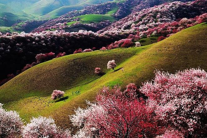 早餐后乘車前往參觀【吐爾根杏花溝】。(賞花時間根據當地的氣候和天氣條件決定,敬請諒解)每年四月份起,伊犁河谷開始進入一個美麗浪漫的季節,山上、草原上的果花、草花次第盛開,美不勝收!最先盛開的就是野杏花。那個季節野杏花綿延十幾公里,粉紅的、雪白的杏花把一個個山頭妝扮起來,牛羊似珍珠灑落在花林間、草坡上。最震撼是這種自然、原生態的壯美,一個花海的世界、一個迷人的仙境!抵達新源用晚餐,晚餐后入住酒店。