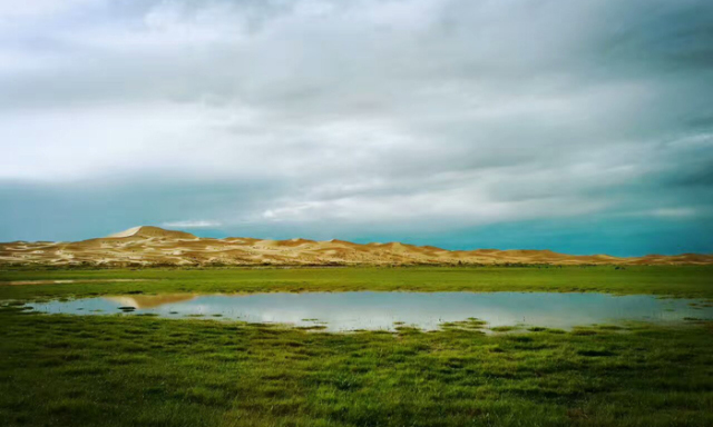 經過小半程的徒步,會遇到一座極高的沙丘,翻越沙丘后豁然開朗。你會驚訝于沙漠的洪荒世界居然有如此的世外桃源,寧靜的湖泊被浩浩蕩蕩的綠洲包圍著,湖畔生長著沙漠腹地極罕見的小樹林,生機盎然。