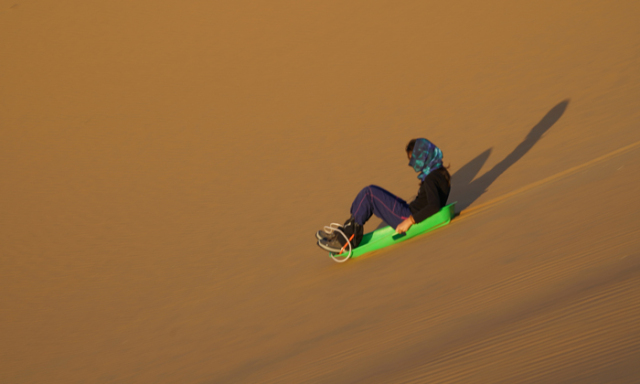 沙漠的山丘每天都在變,一陣狂風之后,原本的平底會突然變成一個沙丘,這樣的沙丘到處都是,滑沙就是沙漠最有樂趣的事情!