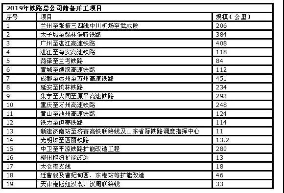 表二:鐵路總公司2019年儲備開工項目