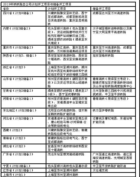 表三:2019年各省市鐵路開工及儲備項目表