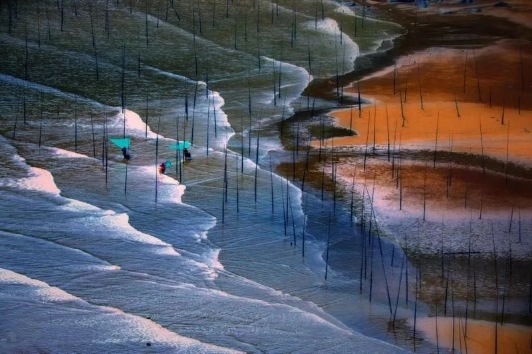 上午:北兜拍攝日出 紫菜場風光,涵江風光,這時候紫菜養殖場,拉竹竿掛苗繩,海面船只穿梭,漁民勞作一派繁忙的景象,滿灘滿海都是竿影人影船影,畫面任你裁減,紫菜還會吸收不同光源;