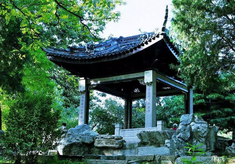 浪滄亭的亭立山嶺,高曠軒敞,石柱飛檐,古雅壯麗,山上古木森郁,青翠欲滴。