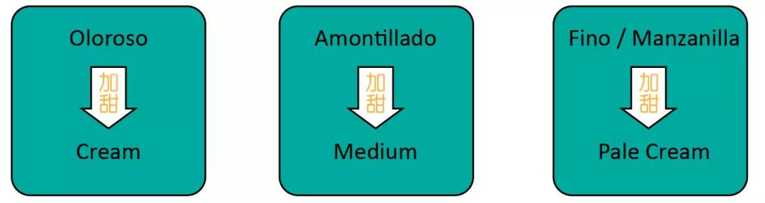 甜型的則是拿曬干的Pedro Ximénez(PX)或者Muscat of Alexandria釀成。這些酒的甜度都非常高,有些甚至都像稀糖漿一般了。它們會被單獨出售,或者有時候干型雪莉會混入這些甜酒做成加甜型風格。