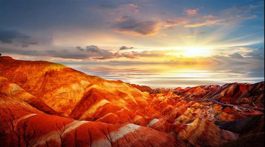 游玩過后前往張掖 [ 丹霞地質公園 ] ,這里的自然景觀得天獨厚,是中國丹霞地貌發育最大最好、地貌造型最豐富的地區之一。景區還是張藝謀的電影《三槍拍案驚奇》、姜文執導的電影《太陽照常升起》、知名電視劇《神探狄仁杰》的外景地,2005年11月由中國地理雜志社與全國34家媒體聯合舉辦的“中國最美的地方”評選活動中,當選為“中國最美的七大丹霞”之—,如果天氣晴好,在這里可以觀賞到一場唯美的落日盛宴。感受落日的余暉落在起伏的丘陵上,晚霞般的大地與落日交相輝映,見慣了城市中的鋼筋混凝土,此時不由的心神也會感到空曠了;