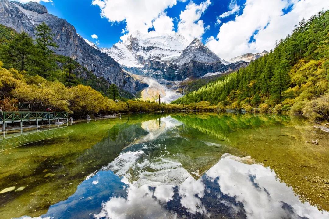 雪山、峽谷、飛溪、古樹、巨石、寺院