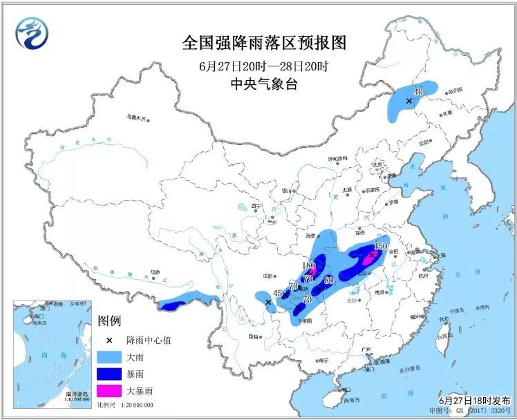 ·27日20時至28日20時,四川東部和南部、重慶、貴州北部、云南東北部、陜西東南部、河南南部、安徽西北部、湖北中西部、湖南西北部等地的部分地區(qū)有大到暴雨,其中,重慶北部、四川東北部、河南南部、湖北東北部等局地有大暴雨,最大小時降水量30~60毫米,局地可達(dá)70毫米以上,并伴有雷暴大風(fēng)等強(qiáng)對流天氣。