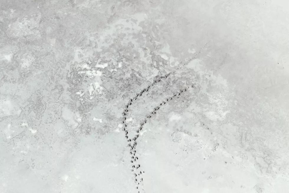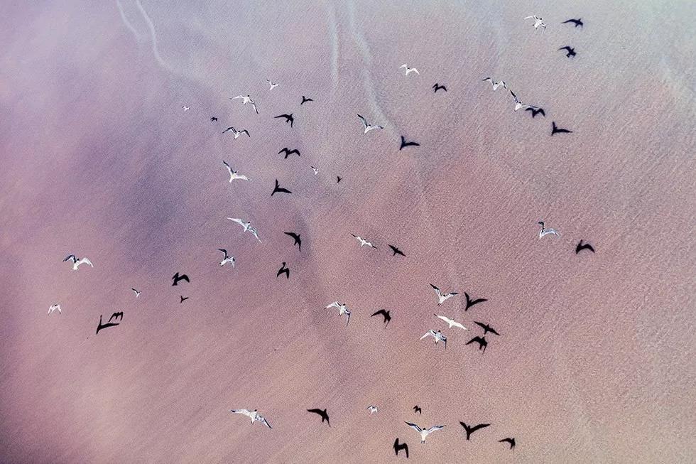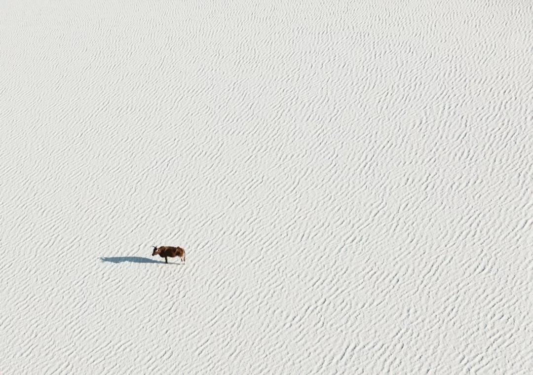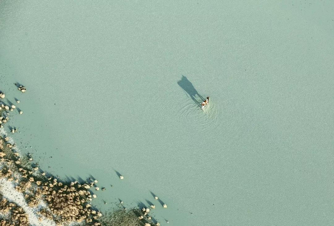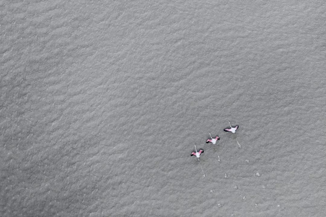 如火烈鳥、好望角大羚羊、甚至是一只在蔚藍的海水中休息的烏龜。動物們行進時留下的痕跡和陰影都是他作品中重要的組成元素。