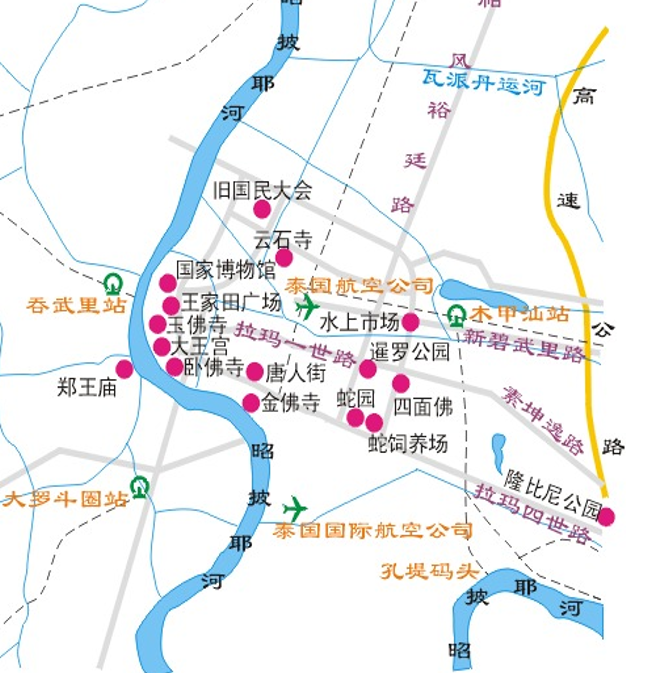 曼谷的市區主要景點如大皇宮、玉佛寺、臥佛寺、鄭王廟都在西部,即湄南河兩岸