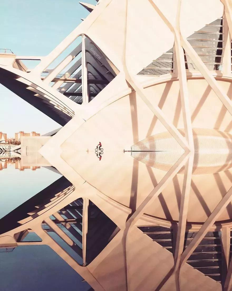 他將同一角度拍攝的航拍照片與普通的照片上下合并,創(chuàng)造出了類(lèi)似于平行宇宙的效果。