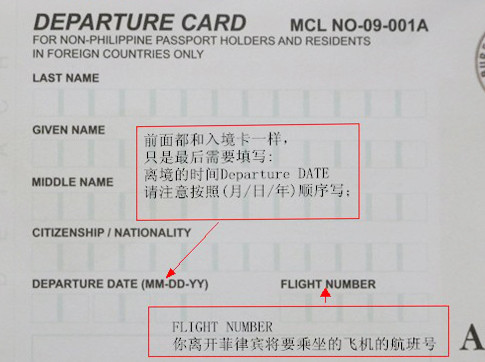 中國公民在結束菲律賓觀光旅游,于機場辦理出境登機手續前,應先交納機場稅,然后到訂購返機票的航空公司柜臺前辦理出境登機手續,領取登機卡和行李卡,同時向航空公司工作人員遞交出境卡。出境卡的填寫內容同入境卡基本相同。