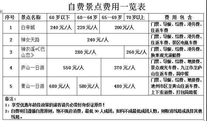 1、自費特色景點最低最低30人成團,如構不成最低成團人數,則取消線路,自由活動;