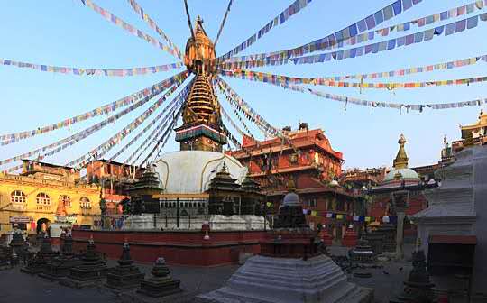 下午參觀加德滿都老皇宮(Kathmandu Durbar Square世界文化遺產)【約2小時】,英勇善戰的廓爾克士兵把守的哈努門達卡宮博物館(猴門,外觀)、古樸精致的庫瑪麗(活女神)廟,之后游覽始建于2000多年前的世界上最輝煌的佛教寺廟“斯旺那布廟”(Swayambhunath世界文化遺產,俗稱“猴山”) 【約1.5小時】,來這里祭祀的有尼佤爾尼姑、藏族喇嘛、佛教及印度教之貴族朝圣者,也許斯旺那布塔是觀察尼泊爾各個宗教融洽相處的最佳地方,整體建筑古樸味道十分濃郁,民房的窗飾極其繁復,寺廟建筑的細部一樣精細,寺廟、佛塔、銅飾等組合在一起,再加上成群的鴿子飛來飛去,成群的猴子蹦來蹦去,形成獨特的景觀。