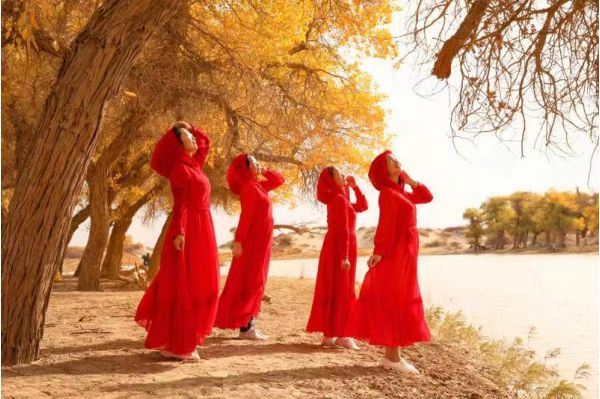 4、穿戴合適的服飾:衣飾最好選擇純色為主(紅色、白色等),以紗質/絲質披巾為主,突出人物色彩。今天大家可以穿一些紅色、藍色、白色的衣物,搭配胡楊林的漫天黃葉,十分漂亮。