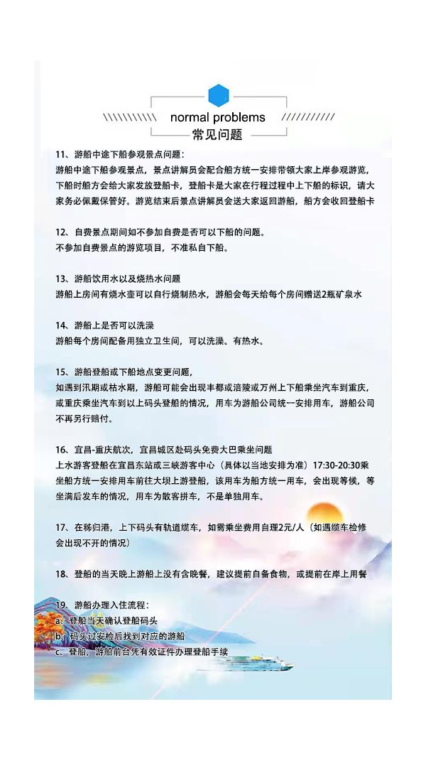 17:00——晚餐成人:不含餐 兒童:不含餐登船當日(大多數游船)晚餐不在船票所含安排之內,建議可晚餐后登船。 1、常規重慶登船為朝天門碼頭,然而朝天門碼頭又細分為十幾個小碼頭,游船停靠就類似于火車停靠站臺一個道理,游船具體停靠在朝天門的幾號碼頭以實際停靠為準,為了防止游船臨時變更停靠碼頭,造成走錯碼頭的情況出現,一般我們會在登船當天中午找游船前臺再次核實登船碼頭后中午12點前告知您具體朝天門幾號碼頭登船,建議您登船前可以撥打游船電話再次核實登船碼頭。