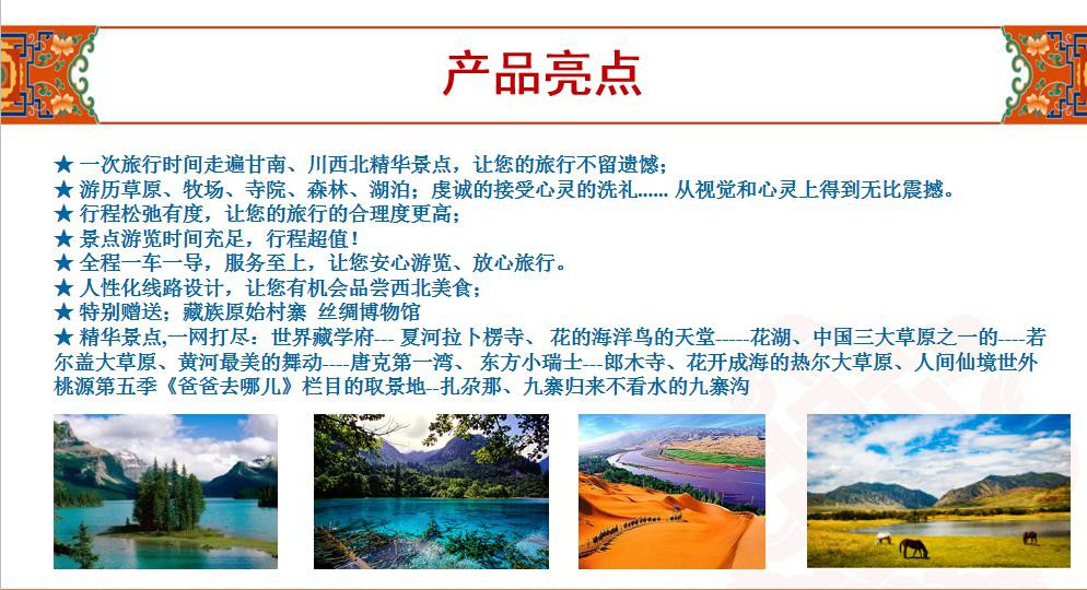 B 線寧夏中衛(沙坡頭、金沙島)/內蒙阿拉善旗(通湖草原)/青海西寧(青海湖)/甘肅蘭州(臨夏東公館、拉卜楞寺、桑科草原、郎木寺、扎尕那石城、日拉米巴佛閣)四川阿壩藏族羌族自治州(九寨溝風景區、藏式村寨、九曲黃河第一灣)空調專列12 日游