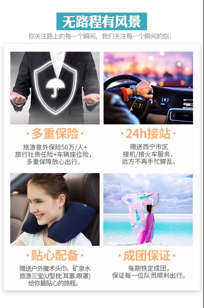 贈送:贈送戶外魔術頭巾、旅游三寶(頸枕耳塞眼罩)、礦泉水;西寧市區24小時接機/接火車服務。(贈送項目不用費用不退)