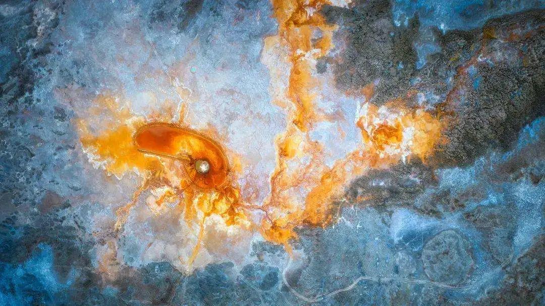隨后我們前往阿拉爾草原深處去探索一方汩汩噴涌了上千年的地熱噴泉——【“惡魔之眼”艾肯泉】,方圓百里,草木不生,鳥獸不近。“艾肯”在蒙語中意為“可怕”,而“艾肯泉”在蒙語中又意為“源頭”,因其湖水成分艾肯泉周圍寸草不生且形成了一個紅褐色的圓形,正中央便是汩汩而出的泉水,這便形成了一個巨大的“眼睛”,被人稱為“大地之眼”。從空中俯瞰航拍,這巨大的眼睛脈絡清晰,栩栩如生,在它周圍點綴著許多青色的小泉眼,神秘而震撼;除了其令人驚奇的血色眼睛造型,艾肯泉還有神奇的“喊泉”屬性,據說站在岸邊朝它大喊,或者是在岸邊跺跺腳,噴泉口的水流量就會加大,會噴涌得更高。
