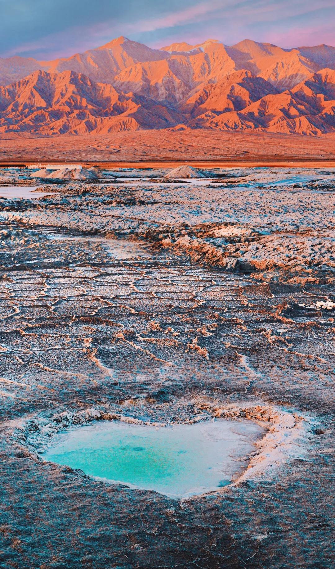 在水上雅丹不遠處便是【東臺吉乃爾湖】。東臺吉乃爾湖被稱為“中國的馬爾代夫”,湖水呈現純正的蒂芙尼藍;乃爾湖岸邊盡是覆蓋著的白色結晶,湖周圍是大片的雅丹地貌,搭配上顏色干凈到極致的湖水、西北特有的廣闊無垠的天空,純粹而強烈的視覺沖擊,這方圓百里大漠戈壁無人區的珍寶明珠,這只屬于大自然的神秘顏色,讓你仿若來到了世界的盡頭,讓你感受一種歸于自然的內心平靜。