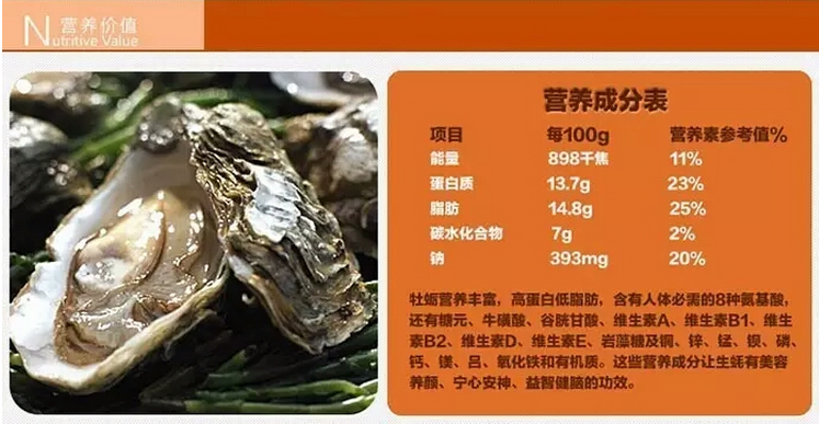 牡蠣是一種高蛋白低脂肪,易消化且營養豐富的食品,其含有豐富的鋅,甘氨酸和一種名為肝糖原的糖類物質,也是牡蠣美味的基礎。