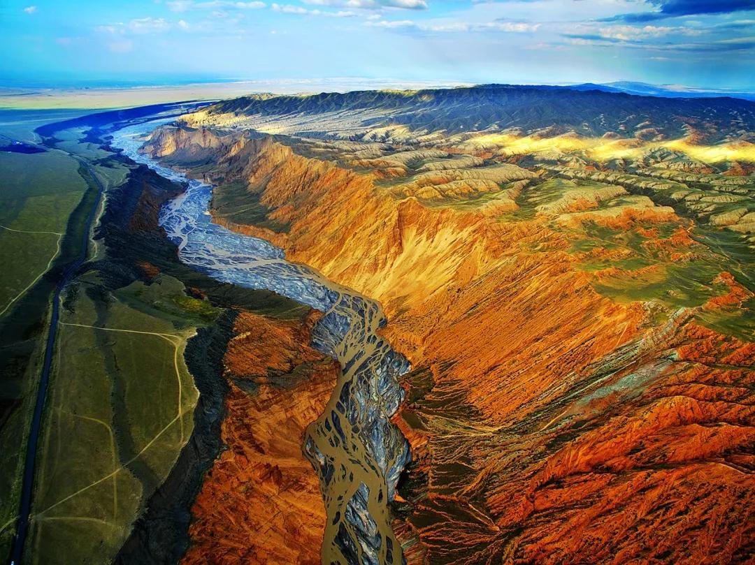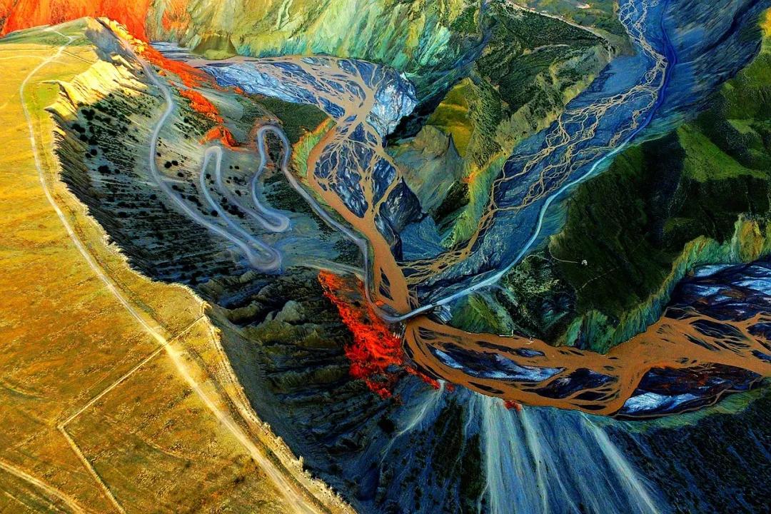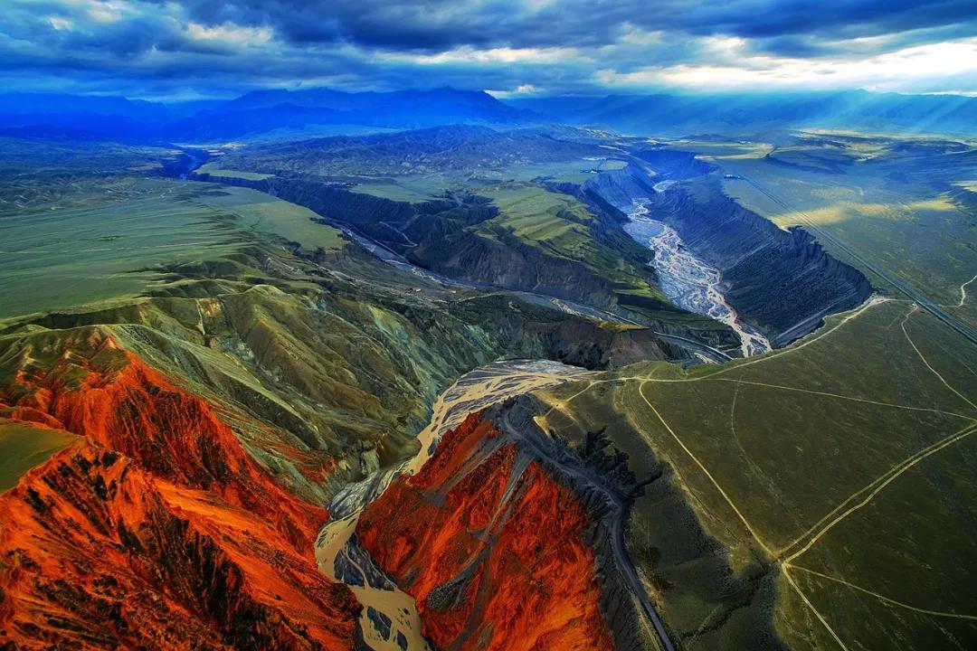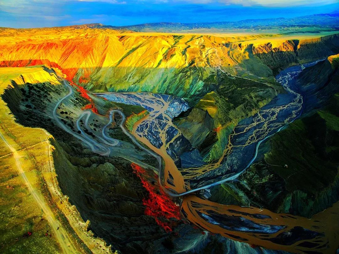 從高空看,安集海峽谷的色彩異常豐富,河流切割大地,將不同顏色的巖層沖刷溶解,形成了一幅絢麗多彩的大地抽象畫景觀。與其他一些色彩灰冷單調的峽谷相比,擁有紅山、黛崖、青峰、綠島、碧水等豐富色彩的安集海峽谷,就像一條彩帶飛舞在天山北坡腳下,成為中國峽谷群中一條色彩最豐富的大峽谷。
