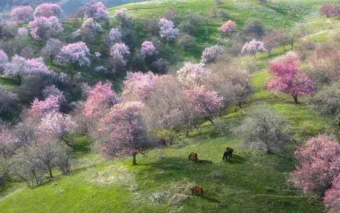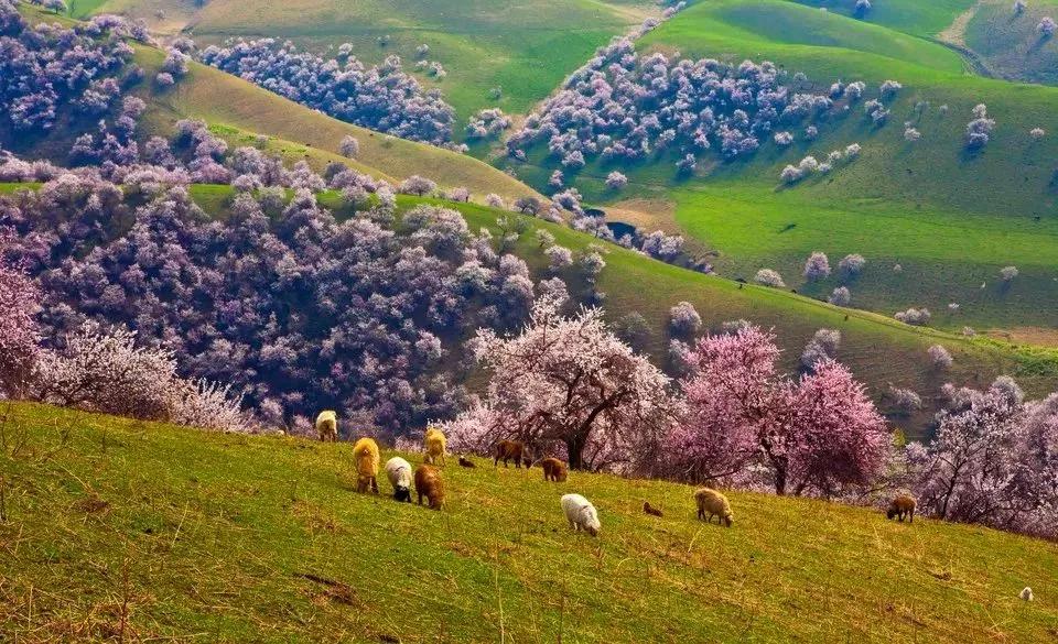 杏花溝山坡起伏,線條優美,每到春暖花開之際,隱藏在伊犁河谷深處的野杏林便變身人間仙境,完勝三生三世十里桃花。