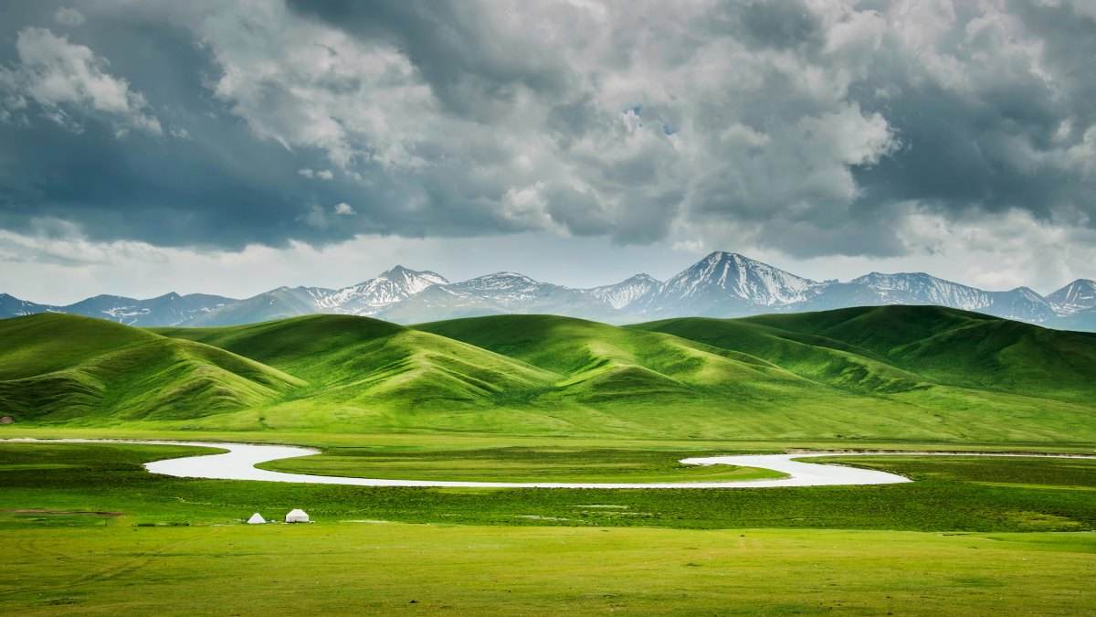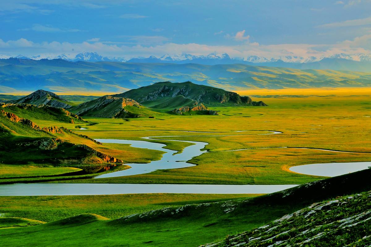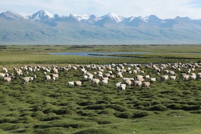 天山是亞洲最偉大的山脈之一,近處草原綠意盎然,牛羊成群,遠處山峰綿延,通體覆蓋著皚皚白雪,神秘圣潔。