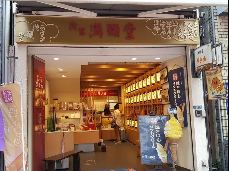 淺草滿愿堂是淺草一家有口皆碑的售賣芋金的人氣店鋪,招牌和菓子芋金是以九州薩摩紅薯為原料烘焙制成的。