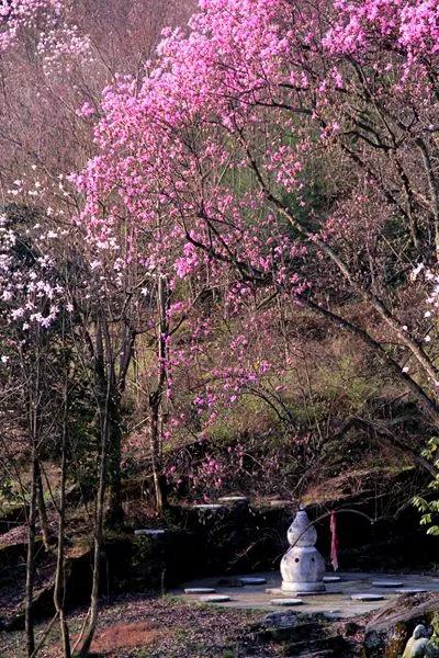 2.在漢中的油菜花競相開放的時候,北川藥王谷的野生辛夷花也是風(fēng)華正茂的時候。漫山遍野的粉色花朵爭奇斗艷,蔚為壯觀。