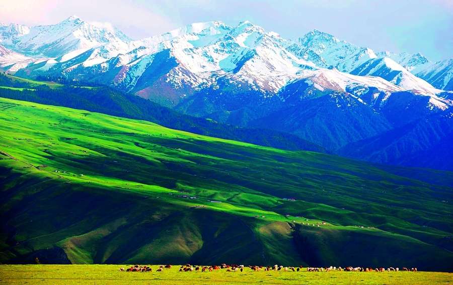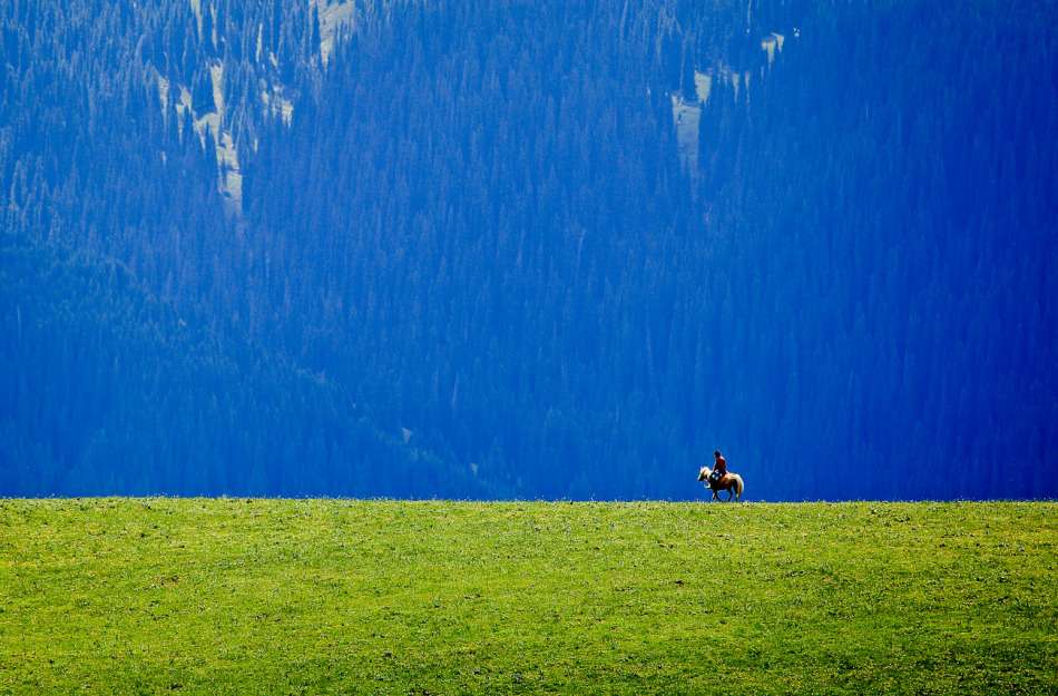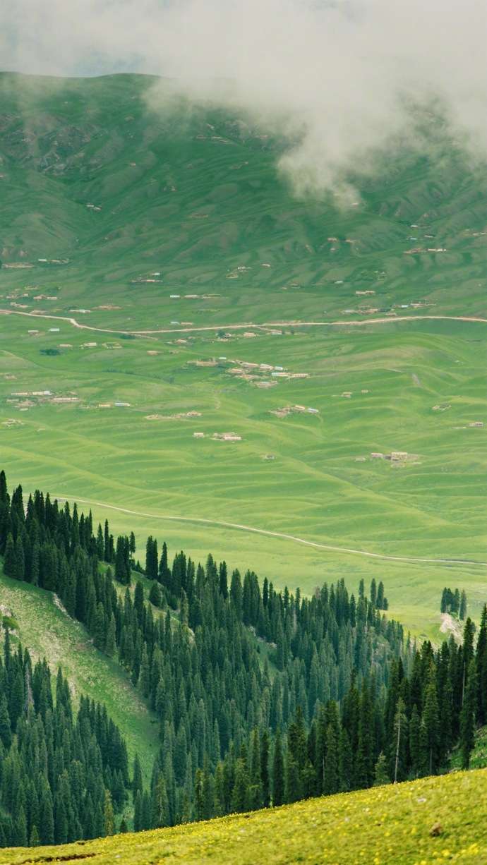 五彩斑斕的花簇、點綴期間的白色氈房、綠毯上散布的流云羊群、墨綠的原始森林、深邃的大峽谷,配以天際的藍(lán)天、白云和雪嶺冰峰,構(gòu)成一幅美麗絕倫的畫卷!