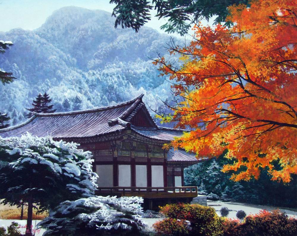 坐落在通往妙香山路旁的普賢寺,建于公元1014 年,寺前有冷杉、海松、水曲柳等多種樹木。寺內主要建筑物有大雄殿、萬歲樓、解脫門、天王門以及一座四角的9 層塔、一座八角的13 層塔。大雄殿的墻壁很高,歇山式屋頂,仿流線型的粗腰房柱,神妙雕塑的裝飾,顯得和諧、端莊。殿內保存著13世紀刻印的6780 卷佛教大經(jīng)典,