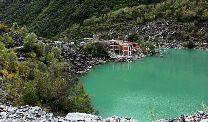 看著眼下這長達12公里的情邀海子,不知該喜還是悲。疊溪,一個曾被毀滅的小城。災難降臨的那一天。一場地震掩埋了一座城。折斷了一條江。但也留下一份補償;不久;幸存下來的人發現了這一串高原堰塞湖。稱它們為“疊溪海子”。 清晨時分。登上高聳于湖畔的雕樓,俯瞰全景,帶狀的水面灑滿金色的陽光。令人迷醉.幾乎忘記隱藏在寧靜與碧綠中的那次災難。幸好有怪石林,那是地震滾落堆積后;在岸坡上留下的又一景觀,告訴人們這份美麗所付出的代價。