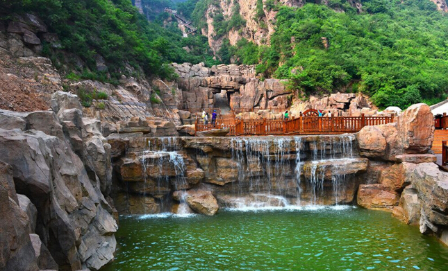 “天路奇觀”,是景區的一條山水游線,全長1000米,臺階1688個。走進天路奇觀,大家可以看到,天路兩邊巨峰對峙,直插云霄,谷深且長,蜿蜒向天,好像一條天路展現在我們的面前,沿途分布著壯美奇特、撼人心魄的景觀,所以稱之為“天路奇觀”。它由迎賓棧道、黛眉三潭(洗心潭、清心潭、靜心潭)、山澗飛瀑、赤壁丹崖等景觀組成,現在我們將逐一領略這奇山、奇水、奇峰、奇路、奇石等風景。