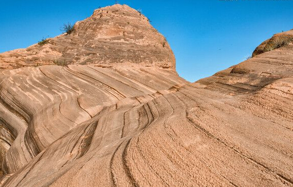 波浪谷是一種紅砂巖地貌,因巖砂上的紋路像波浪而得名,巖石上纖細的紋路,揭示了沙丘沉積的運動過程,紋路的變化反映出每一層砂巖隨著沉積礦物質的含量不同,而產生的顏色深淺差異,紅色主要是由鐵和錳的氧化而產生,這些顏色往往在交錯處和角落里形成更加復雜與抽象的圖案。它的紋理線條比較清晰,像是一層層的波浪,也圍繞著波浪起伏的小山丘形成了不同的走向,極其具有觀賞性。