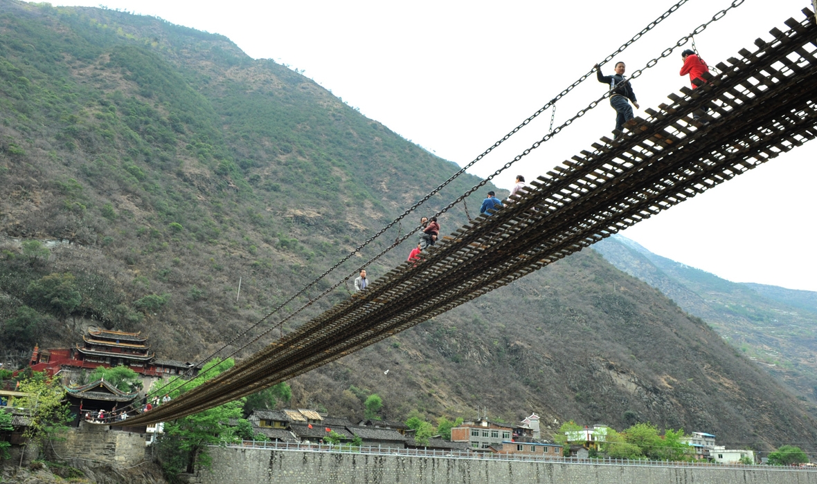 瀘定橋又稱鐵索橋,位于四川省瀘定縣大渡河上,相傳康熙帝統一中國后,為加強川藏地區的文化經濟交流而御批修建此橋,并在橋頭立御牌。該橋始建于1705年,建成于1706年,是中國古代橋梁建筑的杰作,是國務院首批公布的全國重點文物保護單位。 瀘定橋長103米,寬3米,13根鐵鏈固定在兩岸橋臺落井里,9根作底鏈,4根分兩側作扶手,共有12164個鐵環相扣,全橋鐵件重40余噸。瀘定橋兩岸的橋頭古堡為傳統木結構古建筑,為中國獨有。