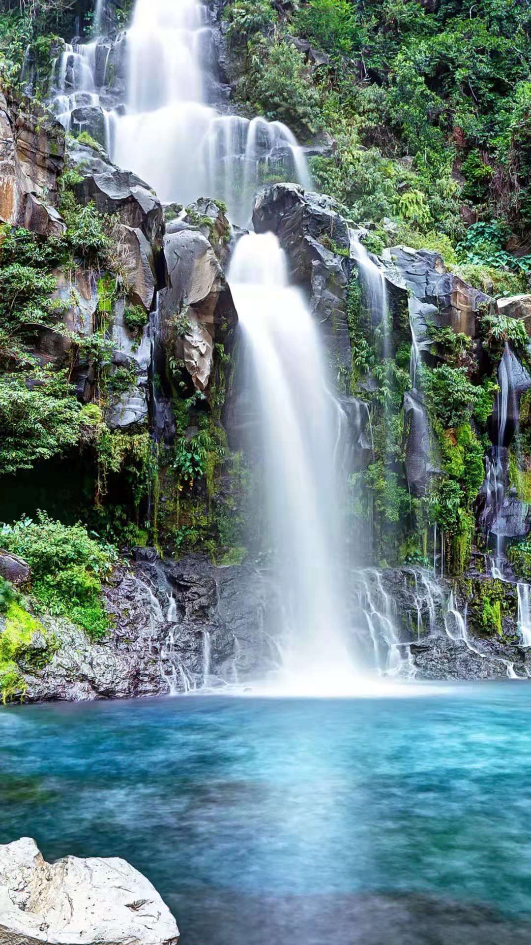 瀑布下方水潭極深,水汽長年彌漫不散,一經陽光折射,一道清麗的彩虹跨其上,故又有“彩虹淵”的美名。下游巨石紛立,是崖