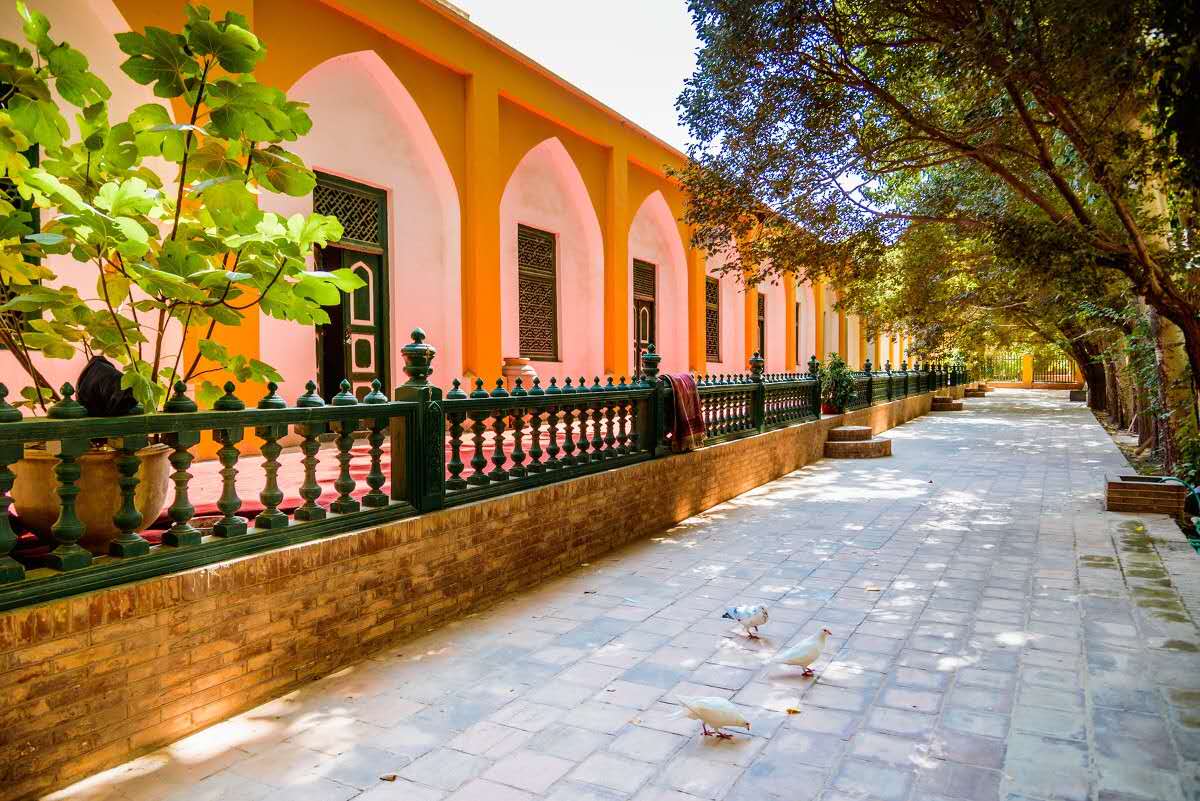 進入寺門是一個八角形穿廳,內有一20畝大庭園,南北兩側各有一排18間的經堂,為伊瑪目講經和宗教學生習經之所。園內設有兩個水池,四周白楊參天,桑榆繁茂,雖居鬧市中心,內中卻格外清靜幽雅。