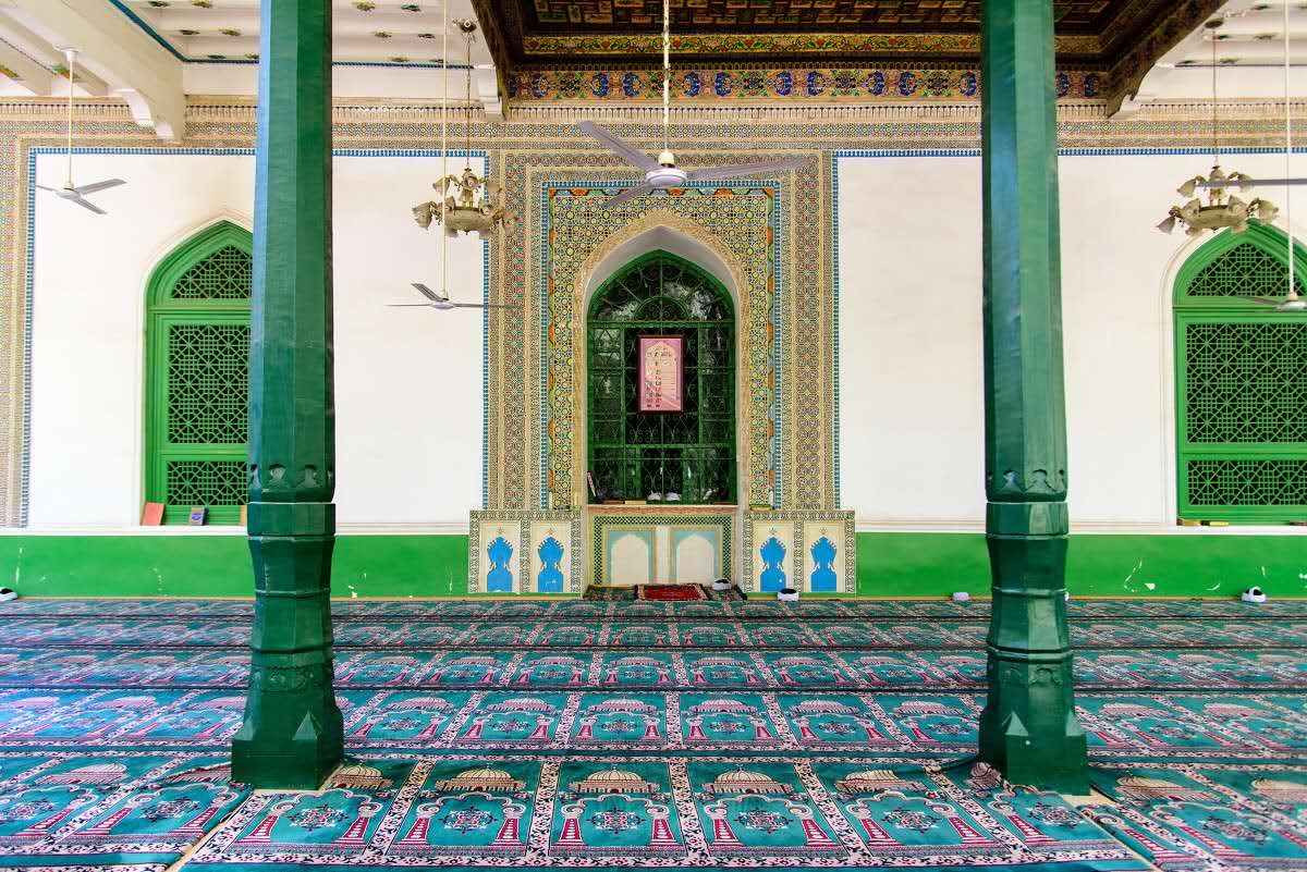 側門,也是平時供人們出入之用的。院落的后面有一排木柵欄,柵欄東側,東西走向人行道的南北兩側,有兩個宣禮塔。塔高6.5米,塔底為長3米,寬2.2米。柵欄全長115米,共有5個木門通向正殿,木柵欄高2.9米,立柱(磚砌)高3.1米,中門高4.1米,兩側立柱高5.2米。版權所有山東聊城聊之旅國際旅行社有限公司,轉載必究!從柵欄的五個門進入禮拜殿,有五個臺階可以上到禮拜殿,禮拜殿分為正殿和外殿,長140米,寬16米,加上向西突出的前廊部分,禮拜殿共2600平米,從中間的八級臺階可直上正殿的前廊。正殿長36.5米,寬10.5米,高8.1米。寺內平時有二、三千人做禮拜,“居瑪日”(星期五)有六七千人;逢節日時在寺內外跪拜的穆斯林可達二三萬人之多。