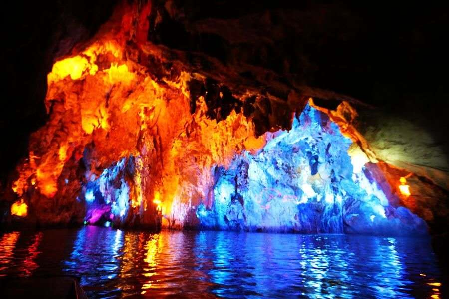 一、二進龍宮被譽為全國最長、最美的水溶洞,為龍宮三絕之一,其蜿蜒于龍宮奇峰異谷之下,堪稱一絕。其中一進龍宮長840米,由群龍迎賓廳、浮雕壁畫廳、五龍護寶廳、水晶宮、高峽幽谷宮五個部分組成,乘船穿行于溶洞暗河之中,頭頂斑斕的洞中奇景若絢麗的夜空,與平靜水面的倒影交相輝映。二進龍宮全長400米,共分為四個大廳。洞內景觀粗曠,鐘乳怪誕,如刀劈似斧削,潭深水幽,曲折神密,水幕電影光怪陸離,船行其中恍如“時光隧道”,妙趣橫生。