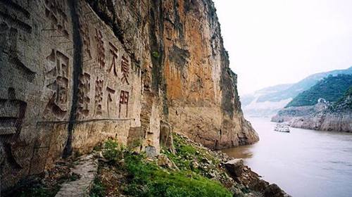 在長江的白鹽山上,有一塊巖壁的顏色和其他地方不一樣,呈現出粉紅色,這里就叫做粉壁墻。而在粉壁墻上,則有著名的瞿塘摩崖題刻。在這些眾多的摩崖題刻里,比較有名的、也可以說形體比較大,大家在船上能清晰地看見的有兩個,一個是由孫元良將軍寫的“夔門天下雄,艦機輕輕過”,寫出了瞿塘峽特色所在;另一個是著名的愛國將領馮玉祥將軍所寫的“踏出夔巫,打走倭寇”,以激勵由此出川抗日的將士。
