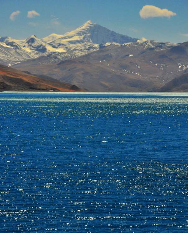 不同時刻陽光的照射,羊湖會顯現出不同層次、極其豐富的藍色,羊卓雍措的水源來自四周念青唐古拉山脈的雪水,沒有出水口,雪水的流入與自然的蒸發達到一種奇特的動態平衡,湖水隨著光線變幻,演化成千變萬化的藍色。下崗巴拉雪山不遠有一段很長的沿湖公路,在此停車駐足,或徒步至湖邊,甚至露營湖旁是感受羊湖的最好方式。