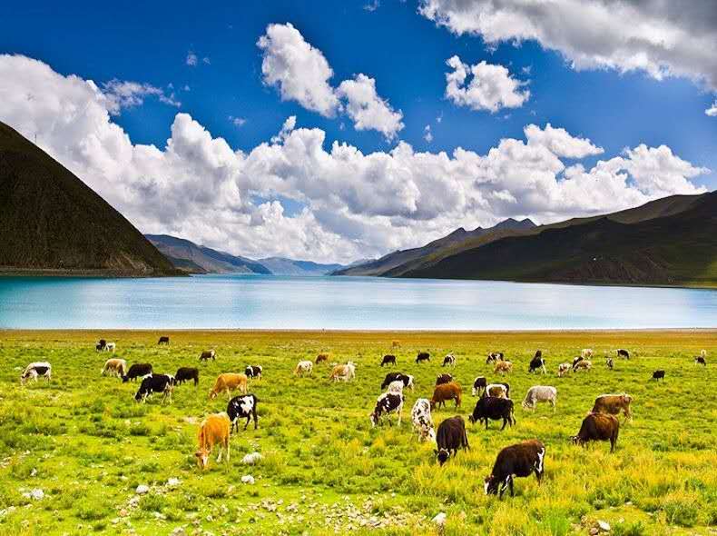 羊湖湖水碧波如鏡,湖濱水草豐美,是一個豐饒的高原牧場,當地藏族人民用民歌贊美羊卓雍錯:“天上的仙境,人間的羊卓。天上的繁星,湖畔的牛羊。”冬天,羊湖冰封,似素衣美女橫躺在喜馬拉雅群峰的懷抱里。春末夏初,牧人便將牛羊運到湖中的十數座小島上,讓它們悠閑地享用牧草。夏天,湖畔水草豐富,正是牧人放牧牛羊的好季節。到了初冬,人與牲畜才重返湖岸。