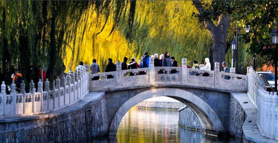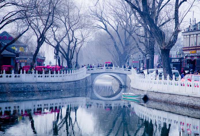 元代營建新大都后這里已是船泊必經之處,兩岸商事繁華,又是風景勝地。遼、金時代雖是郊外,數公里長的水系兩岸也應有便橋方便來往。明代史籍已有明確的記載。解放初期,當我們站在銀錠橋頭平目西望,遠處藍天下的青山綿延起伏,湖邊搖曳的柳絲楚楚動人,猶如掛在空中美麗的巨幅圖畫,每當夕陽西下,金色的余輝從山后撒播在湖面上,微波粼粼,金光閃閃,迷人的湖光山色令人流連忘返,可惜后來的煙囪和高樓大廈嚴重地破壞了京城這難得的獨特景觀,但愿這遺憾和教訓不再發生。