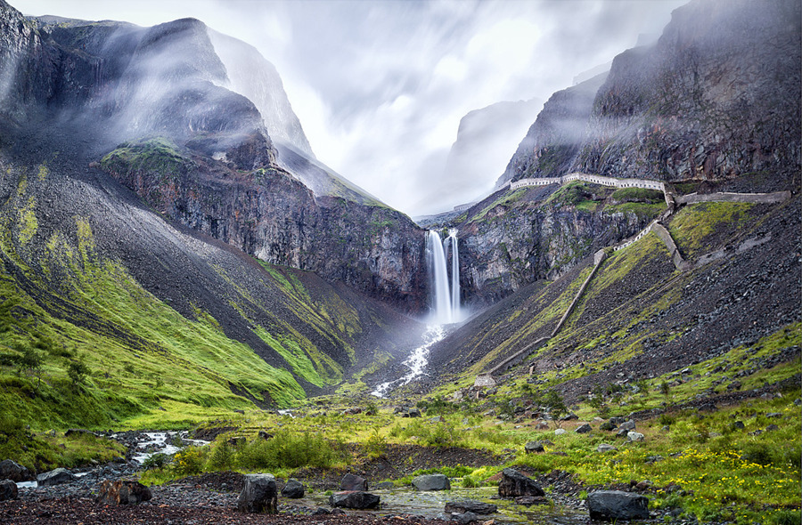 從谷底到瀑布絕頂總長約2300米,瀑布從絕頂傾泄而下,形成了多處飛流。斜坡的右側修建有一條曲折棧道,便于游客觀景。